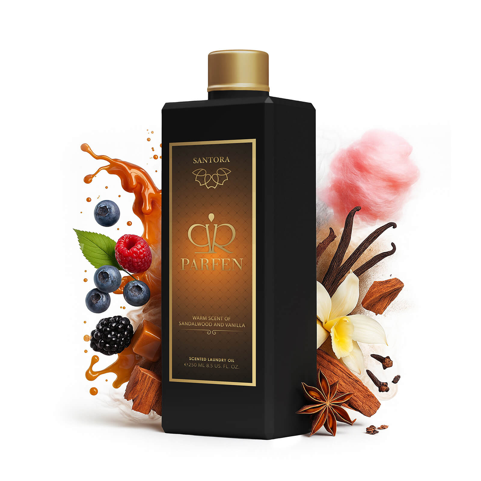 SANTORA ist ein verführerischer Wäscheduft. Nach dem Waschen hinterlässt er auf den Textilien einen süßen gourmandigen Duft, verfeinert mit dem balsamischen Aroma von Sandelholz. Ihre Kleidung oder Bettwäsche hüllt er in warme Nuancen. Noch lange nach dem Waschen verströmt sie einen süßlichen und zugleich delikaten orientalischen Duft.